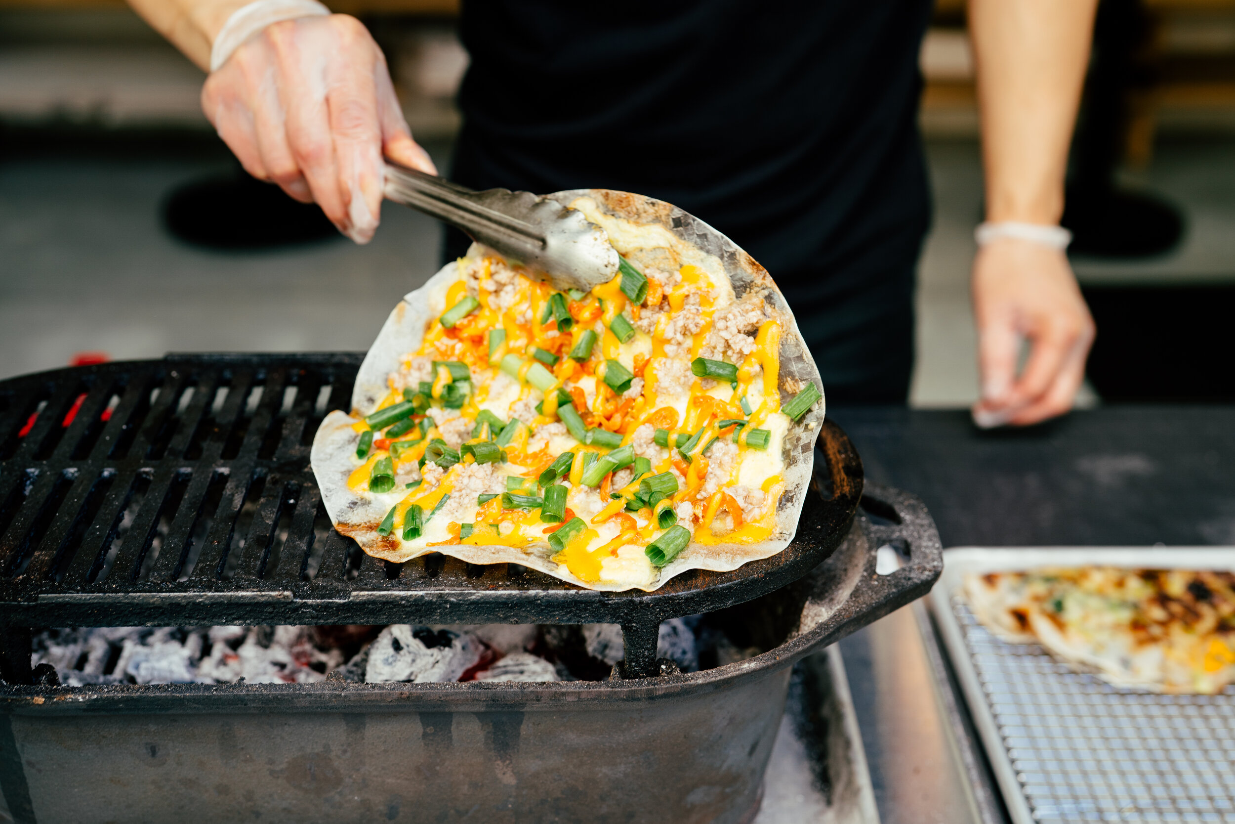 rice paper topped with organic egg, scallion, Lan Roc pork, dried Oregon bay shrimp, and grilled over charcoal. Served with a side of chili oil
